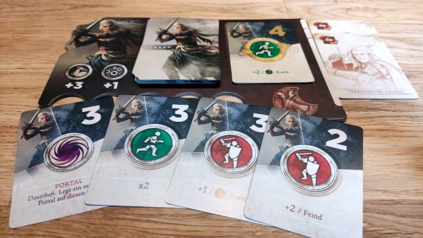 Klingt jetzt vielleicht nicht nach glänzender Spielspaßklinge, sondern nach schartigem Katana. Ich gebe aber zu, dass Soul Raiders einen schon in seinen Bann zieht. Absprachen wechseln zwischen uns. Wer hat welche Karten für welche Aktionen auf der Hand? Wer steigt in den Brunnen hinab? Wer rennt die Treppe hoch? Später verändert sich durch das Ausgeben von Erfahrungspunkten sogar das persönliche Deck. Die verschiedenen Charaktere spielen sich anders, entsprechend motivierend ist die Aufgabenteilung für alle. Auf kooperativer Ebene macht Soul Raiders zunächst viel richtig.