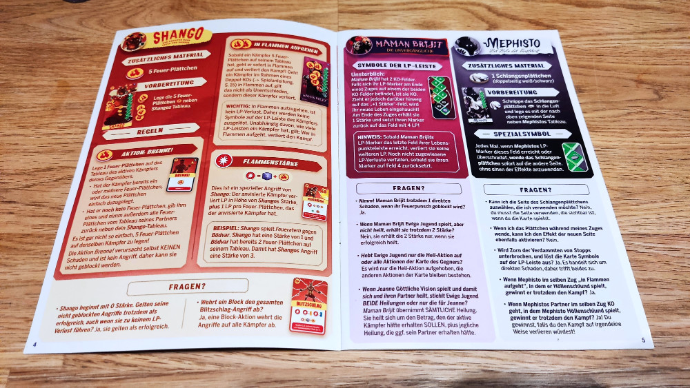 Jetzt zieht jeder von uns drei Karten vom Nachziehstapel, der aus besagten zwei Decks der gewählten Kämpfer:innen besteht. Davon dürfen wir uns aber nur eine Karte aussuchen. Glaubt mir, verdammt schwere Entscheidung. Ich blicke zu Martin und erhasche Stirnrunzeln. Der gute Knabe scheint angestrengt. Dann Lippenlecken. Fieses Grinsen. Was hat er vor? Ich schaue auf meine drei Karten und entscheide mich für eine fette Angriffskarte von Mephisto. Sein Grinsen wird ihm noch vergehen! Jetzt kommt der Clou: Die neue Karte darf ich jetzt in mein Deck integrieren, dabei die Reihenfolge der alten Karten aber niemals verändern. Die Decks werden nach einer Kampfrunde nie gemischt, sondern einfach nur umgedreht. Heißt, meine neue Karte kommt entweder als Erstes aufs Deck, zwischen die zwei Karten Zwillingsschlangen und In der Ruhe liegt die Kraft oder dahinter. Ihr ahnt es sicher schon, aber da Martin das Gleiche macht, ist das Aufeinandertreffen der Karten ab gewissen Punkten verschoben. Das sorgt immer wieder für spannende Entscheidungen bei der Planung und kitzelt ordentlich Mindgame ins Geschehen.