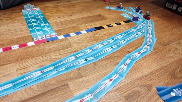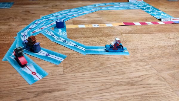 hdkjhgvjjgh – Aua – So, nun hat der Blogger wieder die Tastatur. Klar, dieses erste Rennen war ein Start-Ziel-Sieg meinerseits, aber dies ist natürlich nicht an der Tagesordnung. Die Wahl des Jetskis und damit die richtige Route zu finden, die eben individuell ist und die Breite eines großen Tisches ganz unterschiedlich als Spielball nutzt, ist Teil des Reizes. Je nach Route haben die verschiedenen Jetski mit ihren individuellen Handkarten, aka Streckenteilen, vielleicht einen kleinen Vor- oder Nachteil. Viel wichtiger ist aber die passende Planung. Heißt: Auch wenn Glück beim Ziehen dazugehört, weil du mit Pech eben keine passenden Teile auf der Hand hast, ist die Erfahrung, genau damit umzugehen und die richtige Route vorab zu planen, auch ein Teil der Spielerfahrung. Der kürzeste Weg ist selten der beste! Dazu gesellen sich Platzierungs- und Bewegungsregeln, die dafür sorgen, dass nicht immer optimal angelegt werden kann und auf den Plättchen weiter gefahren werden muss als gewollt. Plötzlich ist der Anlegewinkel hinter dem Jetski und ich kann nur noch geradeaus fahren! So ein Jetski hat bei Speed eben aus sich heraus eine Geschwindigkeit. Einfach weniger weit ziehen ist nicht erlaubt. Thematisch ist das hier großes Kino! Spielerisch sorgt es zudem für kniffligere Planungsspiele beim Platzieren der „Spurenkarten“.
