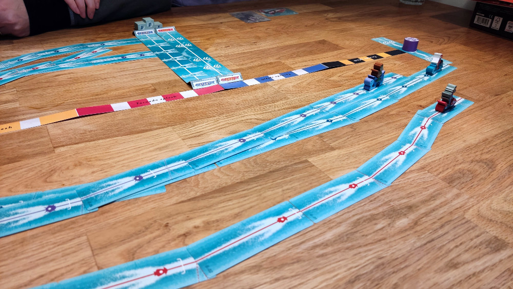 Zu Erklärung: Du darfst Karten auslegen, solange nicht mehr als 3 Wegpunkte ausliegen, dann musst du zwingend stoppen. Gleichzeitig musst du aber auch 3 Punkte fahren. Das Problem, je nach Auslage erreichst du die drei Punkte früher als du möchtest und noch viel schlimmer, die Winkel mancher Karten, was kurvige anlegen ermöglicht, sind hinter dem letzten Punkt. Du fährst also dran vorbei, weil erst komplett auslegen, dann fahren. Du musst da also deine Strecke ganz anders planen als in deinem Beispiel.