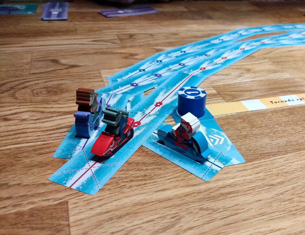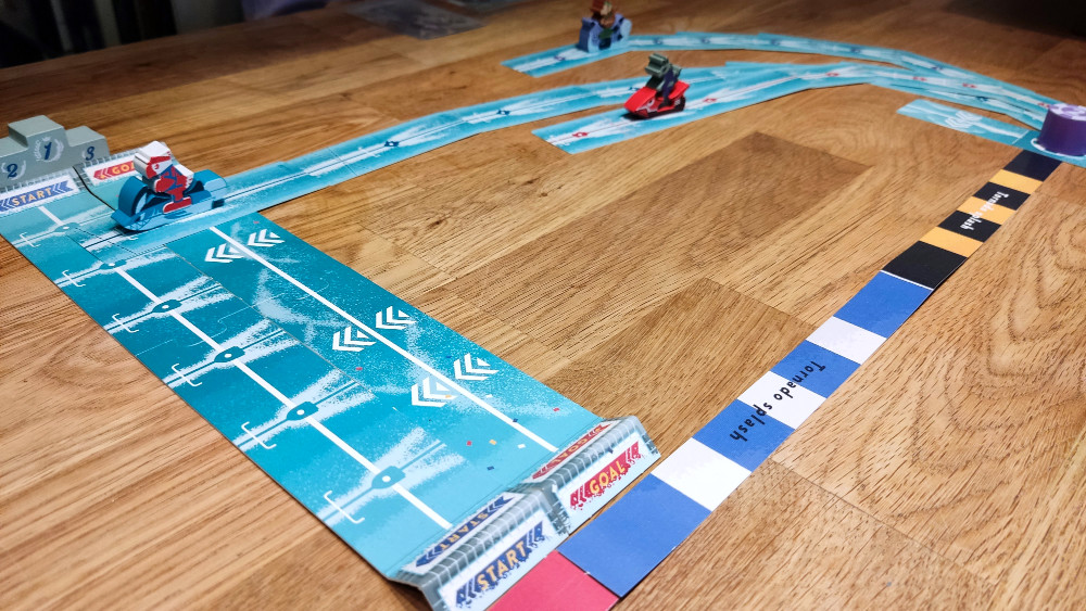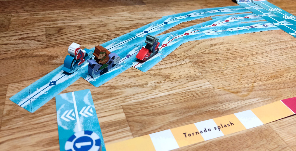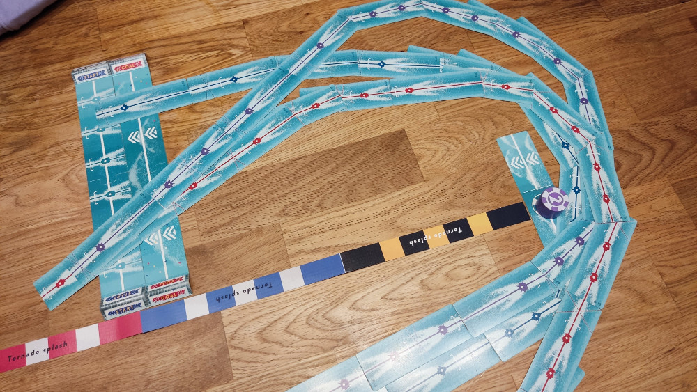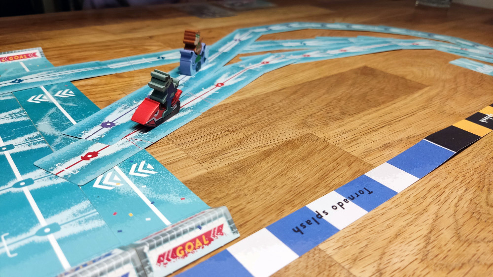 Tornado Splash bietet dabei verschiedene vordefinierte Strecken, die unterschiedlich hart zu meistern sind. Grundsätzlich ist durch das nicht vorhandene Spielfeld aber eine unendliche Anzahl an Strecken möglich. Diese Freiheit am Tisch und die sich ausbreitenden Routen, begeistern einfach. Tornado Splash hat dadurch eine unfassbare Tischpräsenz. Es braucht für ein gutes Spielerlebnis allerdings auch einen wirklich großen Tisch, ansonsten sind die Winkel zu steil. Und auch wenn ich es mit einem größeren Pulk an Jetskis spannender finde, kann es hier stellenweise etwas friggelig und chaotisch beim Platzieren werden. Wer hier empfindlich ist und präzises Anlegen für den Spielsieg vor Spielspaß setzt, sollte eher einen Bogen um das Spiel machen. Das ist aus meiner Sicht aber der einzige und durch die dafür gewonnene Freiheit bedingte Nachteil des Spiels.