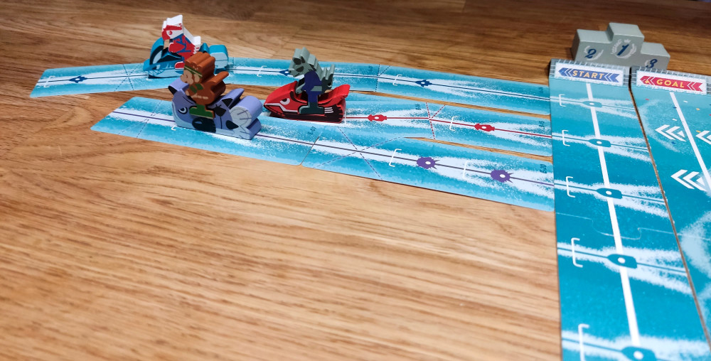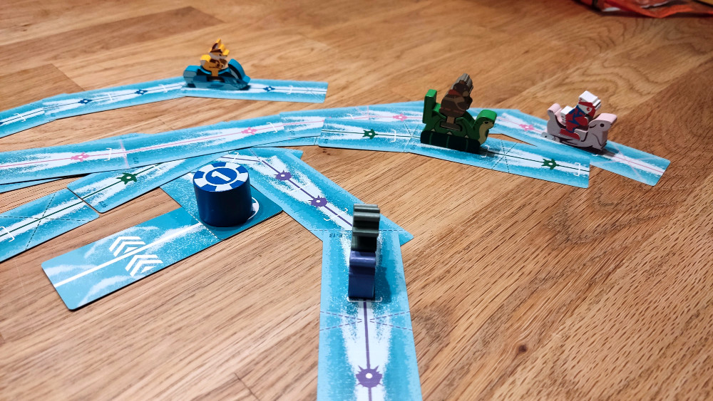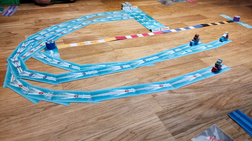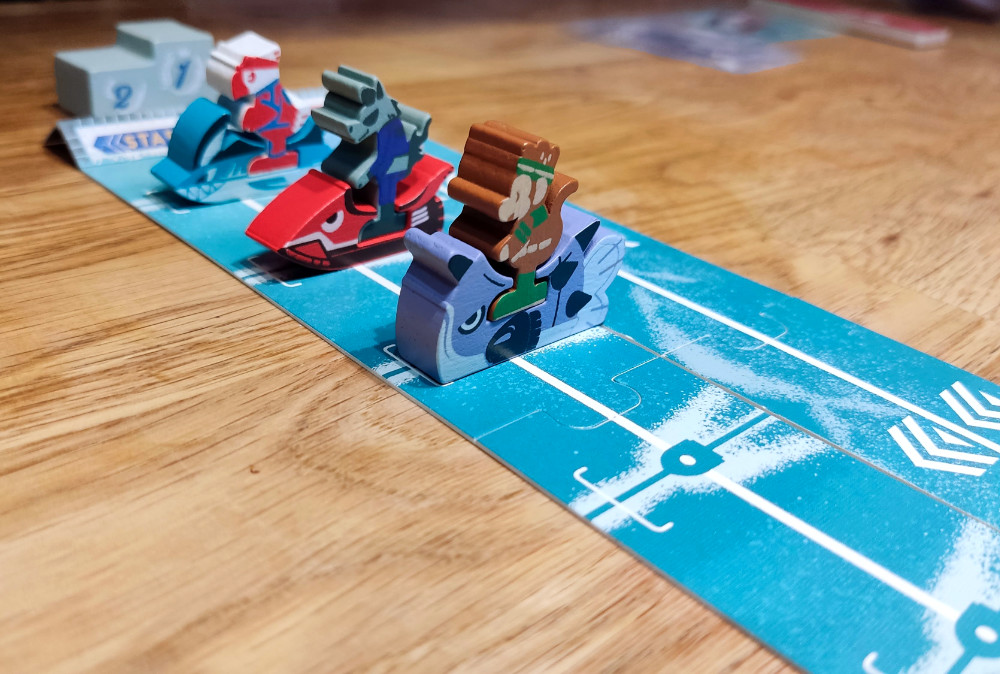 hdkjhgvjjgh – Aua – So, nun hat der Blogger wieder die Tastatur. Klar, dieses erste Rennen war ein Start-Ziel-Sieg meinerseits, aber dies ist natürlich nicht an der Tagesordnung. Die Wahl des Jetskis und damit die richtige Route zu finden, die eben individuell ist und die Breite eines großen Tisches ganz unterschiedlich als Spielball nutzt, ist Teil des Reizes. Je nach Route haben die verschiedenen Jetski mit ihren individuellen Handkarten, aka Streckenteilen, vielleicht einen kleinen Vor- oder Nachteil. Viel wichtiger ist aber die passende Planung. Heißt: Auch wenn Glück beim Ziehen dazugehört, weil du mit Pech eben keine passenden Teile auf der Hand hast, ist die Erfahrung, genau damit umzugehen und die richtige Route vorab zu planen, auch ein Teil der Spielerfahrung. Der kürzeste Weg ist selten der beste! Dazu gesellen sich Platzierungs- und Bewegungsregeln, die dafür sorgen, dass nicht immer optimal angelegt werden kann und auf den Plättchen weiter gefahren werden muss als gewollt. Plötzlich ist der Anlegewinkel hinter dem Jetski und ich kann nur noch geradeaus fahren! So ein Jetski hat bei Speed eben aus sich heraus eine Geschwindigkeit. Einfach weniger weit ziehen ist nicht erlaubt. Thematisch ist das hier großes Kino! Spielerisch sorgt es zudem für kniffligere Planungsspiele beim Platzieren der „Spurenkarten“.