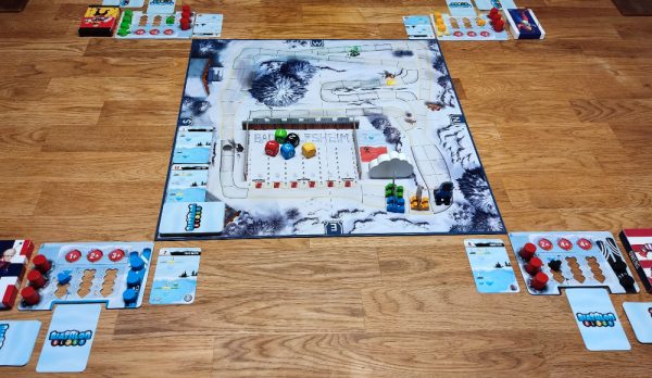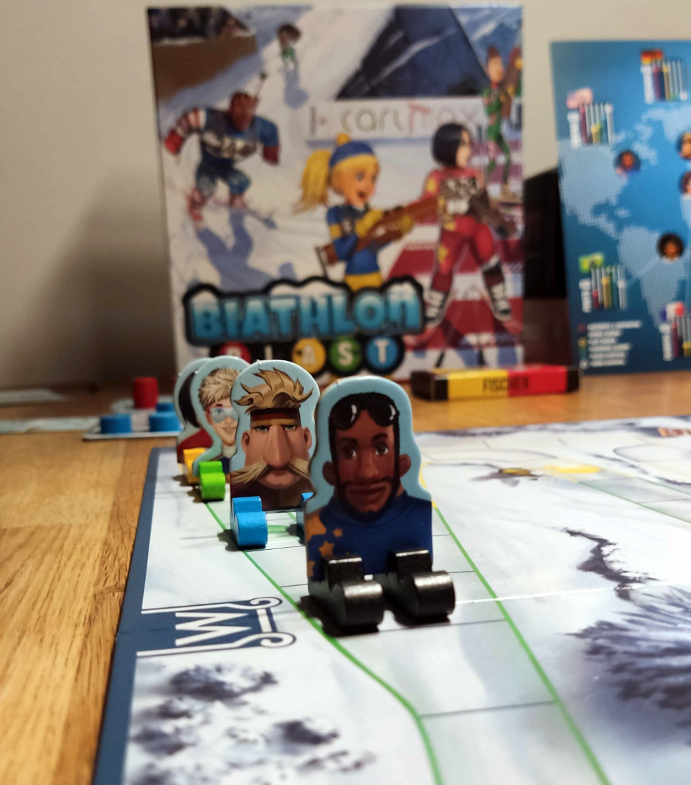 Biathlon Blast lässt sich zu sechst spielen. Wie immer bei Rennspielen: Durch die Masse an Mitspielenden wird es interaktiver, taktischer, noch unvorhersehbarer und es bildet den Sport an sich auch besser ab. Vor allem die Initiative wird hier zum echt spannenden Faktor. Bin ich spät dran, kann die Strecke vor mir blockiert sein und ich verschwende Bewegungspunkte. Stehe ich aber hinten und der Pulk ackert sich einen Anstieg hoch, könnte zu früh dran sein, auch ein eklatanter Nachteil sein. Denn die Strecke vor mir ist vielleicht bisher nicht freigespielt und mit Pech bleibe ich dann sogar stehen, weil mein Speed am Anstieg nicht zum Überholen reicht.