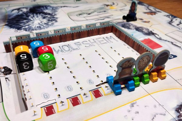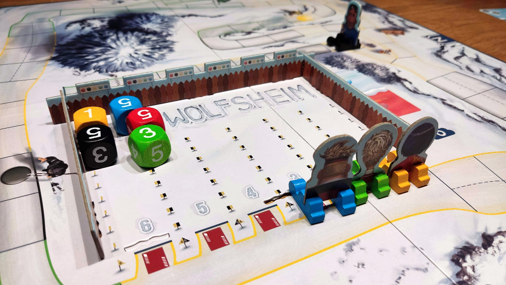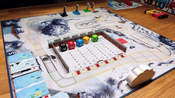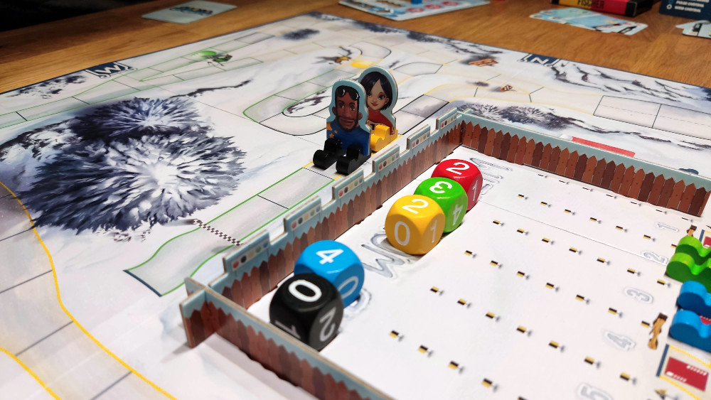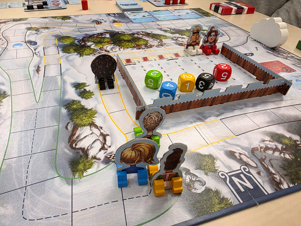 Allerdings dauert es eben, wenn sechs Menschen am Tisch ihre Karten abwickeln. Wird dann noch von den vier möglichen Strecken eine längere und schwere gewählt, was dem Spiel eigentlich guttun könnte, erlebt vielleicht etwas zu wenig Spiel für die Spielzeit. In solch einem Szenario müssen schon alle sehr viel Lust auf das Spiel haben. Doch aufatmen: Auch zu viert ist das Spiel immer noch eine Wucht, wenn auch durch die nicht modularen Strecken anders als bei Flamme Rouge etwas die Abwechslung fehlt und im Hinblick auf Heat und deren Championsship-Modus der Tiefgang im Deckbuilding. Dafür ist die Asymmetrie von Anfang an höher, was aber ohne Erfahrung auch zu Problemen führen kann. Zumindest war es in unserer Familie öfter Streitpunkt, ob gut gespielt wurde oder das Deck und die gewählten Skier zur Strecke am besten passten. Größter möglicher Knackpunkt: Das Glück beim Schießen und die Veränderung der Werte auf den Würfeln. Denn manche Karten zielen auf diese Werte ab. Hier kann es zu Frust kommen, wenn mein Plan durch Zufall hart durchkreuzt wird.