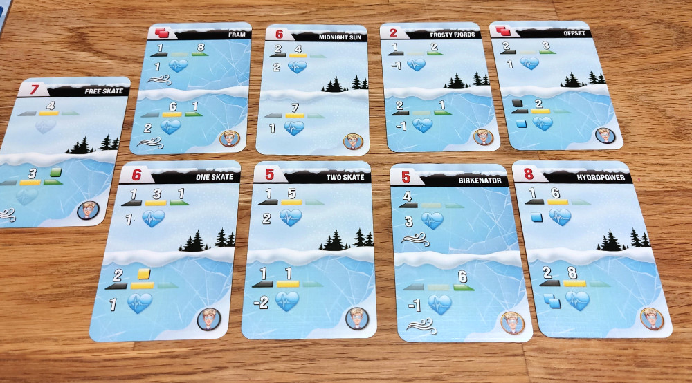 Biathlon Blast reiht sich ganz klar in eine Riege mit Flamme Rouge und Heat: Pedal to the Medal ein. Das alleine ist schon eine Ansage, gehören doch beide Titel zu dem Kreis der einfachen, thematisch dichten und hoch spannenden und damit besten Wettrennspiele. Auch Biathlon Blast bringt genau diese Attribute auf die Tischplatte und überholt in einigen Elementen sogar die Konkurrenz. Doch zunächst ein kurzer Überblick zu Mechanik und Ablauf. In Biathlon Blast wählt jede Person eine Biathletin oder einen Biathleten aus, der einer Nation entspricht und unterschiedliche Stärken in seinem Deck besitzt, welches du komplett auf die Hand bekommst. Dazu wählen alle ein Ski-Set-up, welches sich durch Sonderfähigkeiten das Wachs unterscheidet und damit unterschiedliche Boni auslösen kann. Hier wird also Asymmetrie direkt fett geschrieben! Ob beim Schießen, am Berg, in der Abfahrt oder vielleicht bei der Pulskontrolle: Du spürst absolut deine Auswahl auf der Piste.