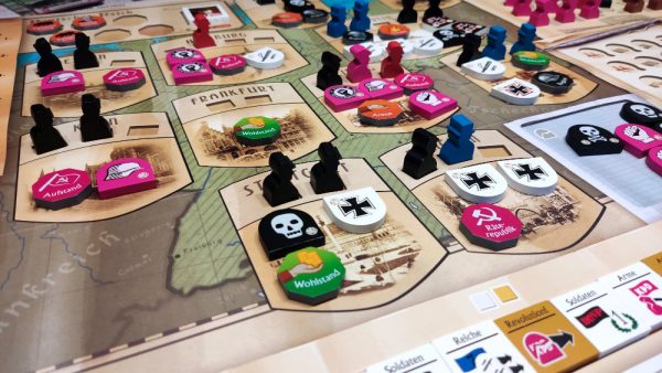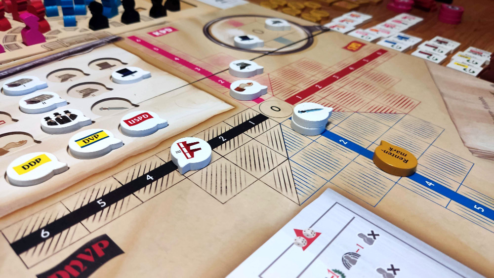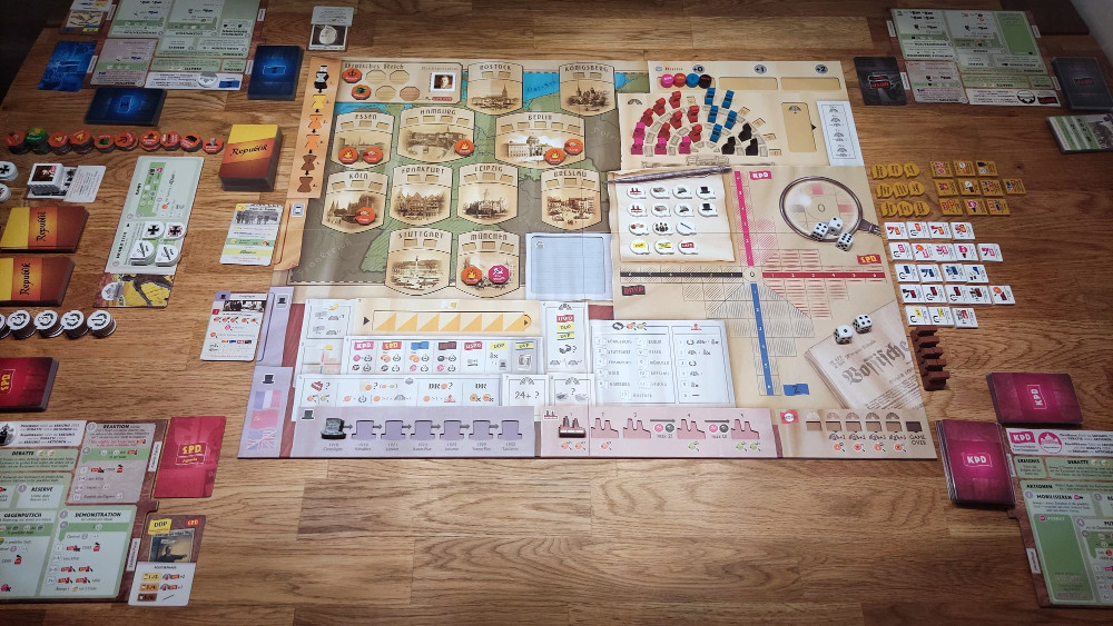 Tatsächlich ist es aufgrund der Spiel- und evtl Erklärdauer nichts für ein spontanes Spiel. Man muss es planen und im schlimmsten Fall ist nach Runde 3 alles vorbei, weil die KPD das Parlament erobert hat. Daher immer ein Reservespiel dabei haben 🙂