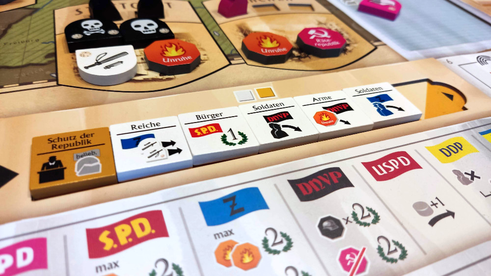 Die gezogenen Republikkarten auf der Hand besitzen eine Sonderrolle. Hier darf zwar gewählt werden, ob ich Aktionspunkte für Debatten oder Städte nutze, das Ereignis wird aber immer (!) zusätzlich ausgelöst. Das sorgt dafür, dass zum einen zwingend die historischen Ereignisse auftreten, zum anderen werde ich an dieser Stelle aber gespielt. Ich habe keine Wahl. Habe ich als SPD die Karte Armut, die mir ungemein schadet, muss ich sie irgendwann in der Runde spielen. So geht es aber allen am Tisch. Deja-vu: Jede Runde fühlen alle ihre Scheiße auf ihrer Hand. Wie gehe ich also mit den Konflikten dieser Zeit um? Zu welchem Zeitpunkt ist es für mich das geringste Übel oder schadet es anderen mehr? Ja, hier werden alle gespielt, aber es birgt trotzdem taktische Entscheidungen und ballert einem eben die Irrungen und Wirrungen der damaligen Zeit um die Ohren.