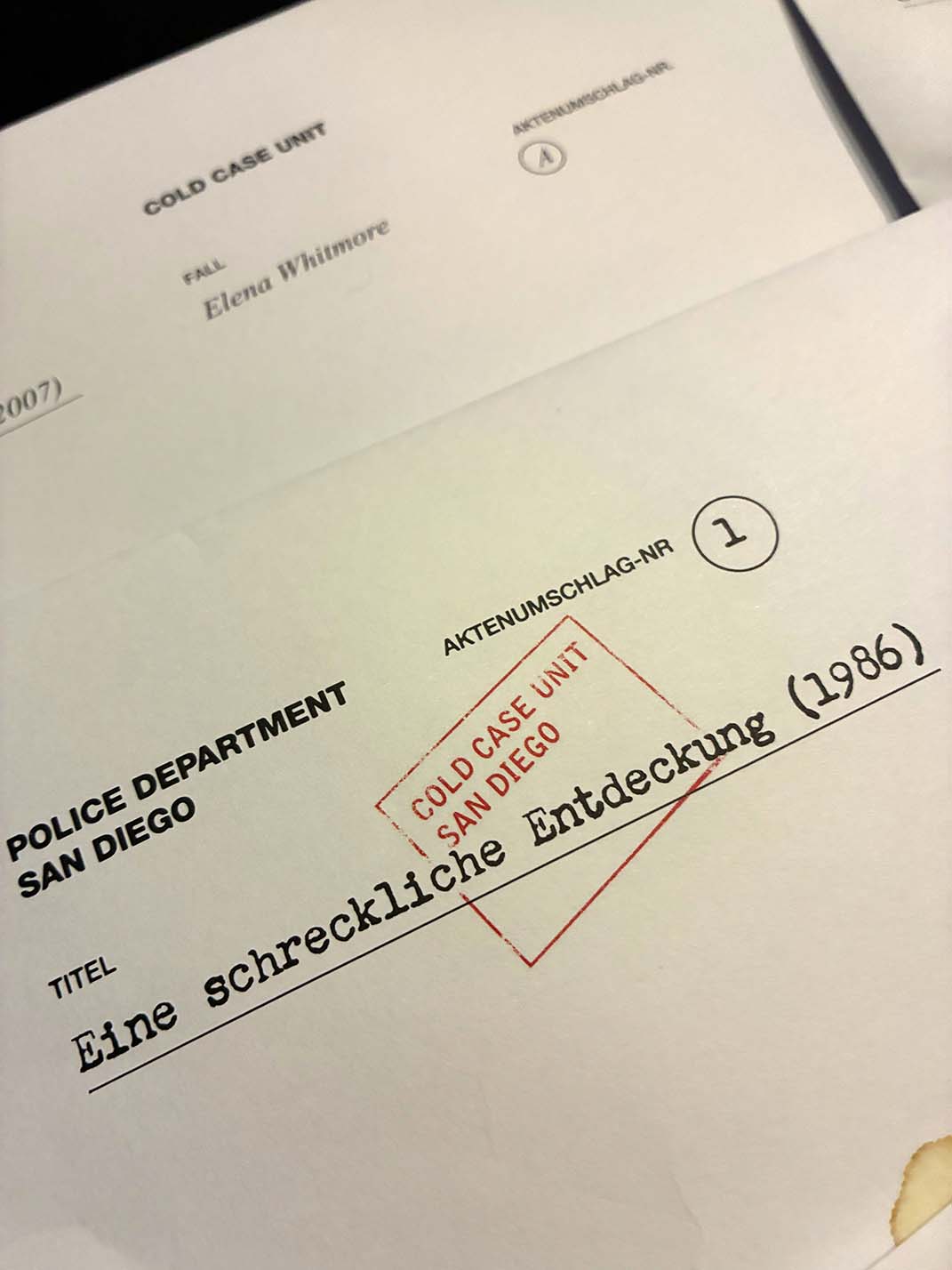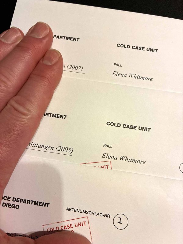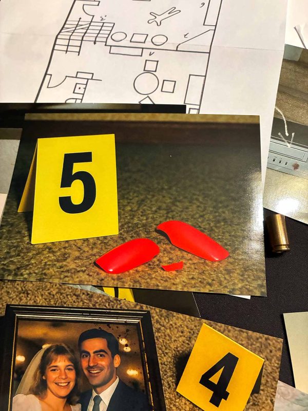 QR-Code gescannt und los geht es. Wow. Die Atmosphäre, die die beiden Thrillerautorinnen Nadine d’Arachart und Sarah Wedler vom Podcast Mord Hoch Zwei am Tisch erzeugen, ist schon sehr edel. Gebannt sitzen Lukas, Lissy, Kati und ich an einem verschneiten Winterabend in den Weihnachtsferien mit warmem Tee und Tapas am Tisch und lauschen der Einführung. Wir bekommen den aktuellen Fall präsentiert. Eine Frau wurde tot in ihrer Wohnung aufgefunden. Die Szenerie wird mit sachlicher Analyse und angenehmen Stimmen beschrieben und ich tauche langsam in den Fall ein. Wir sind an exakt dem gleichen Punkt wie die Ermittler in den 80er Jahren. Sofort kommt mir Crockett’s Theme in den Kopf und ich bin voll dabei, als wir den ersten Umschlag mit den vorhandenen Beweisen sichten. Fotos und Skizzen, die wir gemeinsam betrachten.