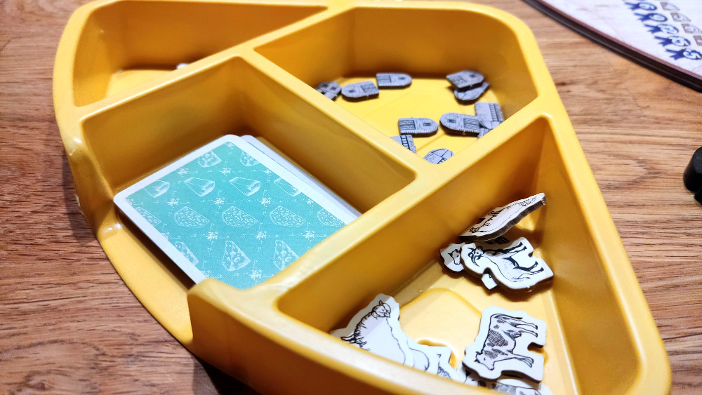 Was sich unfassbar anfühlt, ist die geringe Spielzeit. Natürlich logisch, weil wir simultan spielen, aber hier sitzen wirklich vier Personen, bei einem seichten, aber fordernden und interaktiven Brettspiel nur 30 Minuten am Tisch. Wenn es interaktiver wird und die Spielerfahrung steigt, werden es vielleicht auch 45 Minuten. Das ist trotzdem unfassbar wenig im Vergleich. Auch die Anpassung an die Personenanzahl ist vorbildlich, weil über das Double-Layer-Spielbrett andere Aktionsfelder eingeschoben werden. Mein größter Kritikpunkt ist am Ende einfach das verwirrende Konzept des fehlenden Engine-Building. Daraus kann ich dem Spiel an sich keinen Vorwurf machen, aber auch wenn alles nach Käse schreit, aussieht und fast riecht, fühle ich den Käse zu keiner Zeit. Als Fan von thematischer Verankerung trotzdem ein Downer.