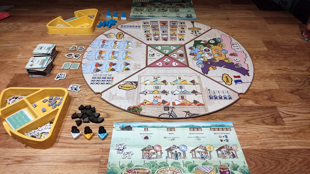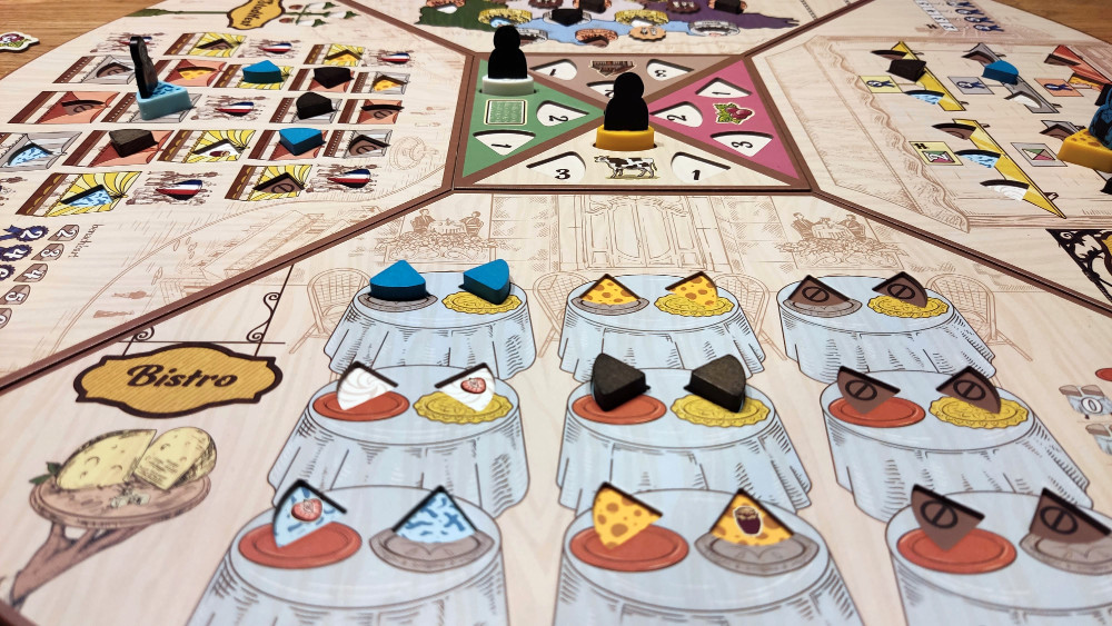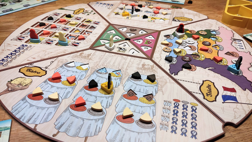 Wusstet ihr, dass Käse Drehschwindel auslöst, zumindest dann, wenn Fromage gespielt wird? Denn da purzelte Hartkäse mit Weichkäse und Schimmelkäse über die Tische und ich hetzte auf dem Rondell zwischen Markt, Bistro, Käsefestival und Frankreichs Regionen hin und her. Und das nicht im übertragenden Sinne. Denn das sich drehende Spielbrett ist schon verdammt sexy und besitzt enormen Aufforderungscharakter. Allerdings ist das nicht das einzige Ass im Käse! Fromage hat mehr zu bieten als nur gimmickartige Schauwerte. Und genau durch diese werden wir uns jetzt genüsslich knabbern, denn ihr wollt sicher wissen, ob Fromage neben anderen thematischen Genrevertretern der „Genussmittel-Brettspiele“ wie Bier Pioniere oder Viticulture bestehen kann!