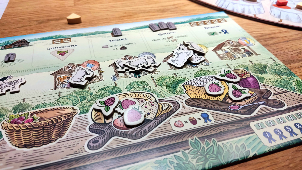 Thematisch geht es nicht darum, über die meisten Siegpunkte zu einem Käse zu mutieren. Das wäre mal etwas Neues gewesen. Aber es geht auch nur so halb um Käseproduktion, denn Fromage besitzt kein Engine-Building, wie Viticulture, nur dass statt Wein Käse produziert wird. Trotzdem bildet Fromage in gewisser Hinsicht diese Idee der Käseproduktion ab. Mein Tableau sammelt Marmelade für den Käse, ich kann Gebäude bauen, um mein Spiel strategisch zu verändern, die Tiere der Milchproduktion können gefunden werden und auch der Reifeprozess des Käses ist inkludiert. Und irgendwie spielt die Auslieferung des Käses in Bistros oder auf Käsefestivals eine Rolle. Die Thematik ist am Ende aber eher nur ein Anstrich, wenn auch ein passender und hübscher. Die Stärken des Spiels sind an anderer Stelle zu finden.