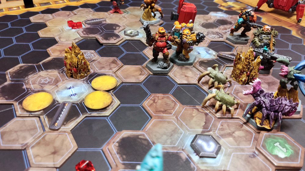 Deep Rock Galactic: The Board Game ist ein kooperativer Zwergen-Sci-Fi-Dungeon-Crawler ohne Kampagne. Erstes Aufatmen. Und es basiert natürlich auf dem gleichnamigen Videospiel von Ghost Ship Games. Statt Pixel gibt es in der Deluxe-Version massenhaft gut modellierte, aber eben unbemalte graue Figuren. Ich spielte den Brettspiel-Grinch und verlangte bemalte Miniaturen. Vielleicht komme ich so um das Spiel herum? Plötzlich malte die gesamte Familie. Okay … meine Familie schien wirklich hochmotiviert und überzeugt vom Spiel zu sein. An dieser Stelle die Anmerkung: Viele dieser hammermäßigen Figuren wurden nicht von mir bemalt. Und ganz ehrlich, langsam wuchs auch mein Durst auf Bier, ich hörte in der Freizeit plötzlich „Zwergenrock“ (YouTube) und wollte nun mit der Familie in die Tiefe steigen. Denn ganz wie im Videospiel geht es auch im Brettspiel zu. Wir starten von der Landekapsel hinein in die Planetenkruste, wühlen uns durch Höhlen, immer auf der Suche nach missionsspezifischen Kristallen, Proben oder Artefakten. Und natürlich lauern in den Tiefen unzählige abartige Kreaturen (Glyphid-Insekten), die uns die Hölle heißmachen wollen.