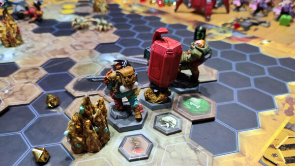 Eine Stunde später. Ich bringe meinen Driller, perfektioniert auf den Abbau von Mineralien und dem Schaffen von Gängen, in Stellung. Gleich wird abgebaut und dann nach Hause. So gut wie keine Käfer mehr in den Höhlen. Easy-peasy. Gut geplant stehe ich für den letzten Abbau gar nicht so weit von der Evakuierungskapsel entfernt. Inga steht dort schon mit ihrem Gunner. Die Gatlinggun im Anschlag, wenn auch mit wenig Munition. Mailo hat ganz in ihrer Nähe den Scout auf die Lauer gelegt. Mit großer Reichweite und Leuchtfackeln, die unsere Sicht verbessern, kann er bestens eingreifen. Lukas hingegen steht mit dem Engineer neben mir. Plattformen für Abgründe braucht er wohl keine mehr zu bauen, wir haben gleich gewonnen. Der Plan: Ich baue jetzt zweimal ab und gehe mit der letzten Aktion schon einmal Richtung Kapsel. Er ist nach mir dran und verwendet alle drei Aktionen für die Bewegung und kann die Kapsel betreten.