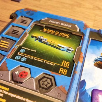 Zum Spiel: Es gibt eine deutsche Anleitung als PDF. Die Tableaus, die Upgrades, die Waffen, die Insektenkarten … alles sprachneutral. Dabei funktioniert auch die Symbolsprache. Allerdings sind die Ereigniskarten mit Text. Meine Kinder (11 und 15) bekommen dieses Englisch schon hin. Ansonsten muss man diese Karten vorlesen.