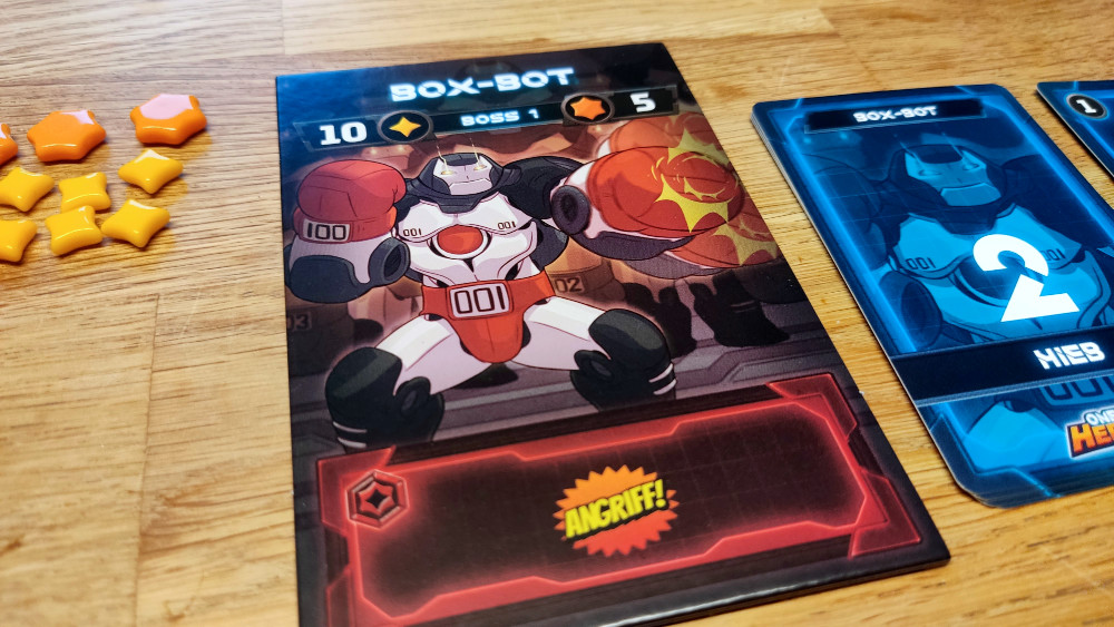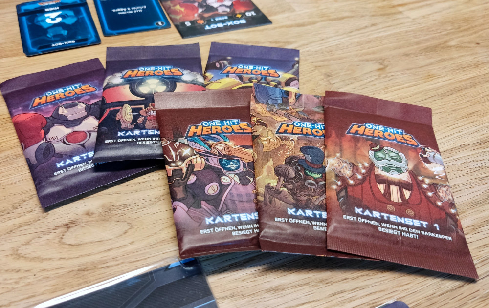 Jetzt ein kleiner Seitenhieb auf das gefeierte Boss Fighters QR. Es ist schon wirklich beeindruckend, wie unterschiedlich die Bosse gestaltet sind. Gerade beim Erstkontakt, wenn noch nicht klar ist, welche Aktionen im Deck des Bosses lauern, steigt die Spannung. Dies gepaart mit der erwähnten Kreativleistung für Boss-Mechaniken macht One-Hit Heroes zu einem abwechslungsreichen Spiel, welches die Neugier auf den nächsten Boss ungemein hochhält. Ganz ohne App! Natürlich auch, weil wir nach jedem Boss eine Boosterpackung öffnen dürfen. Plötzlich gibt es Rudelbildungen am Tisch, weil jede Person jedes Kind diese Packung aufreißen will.