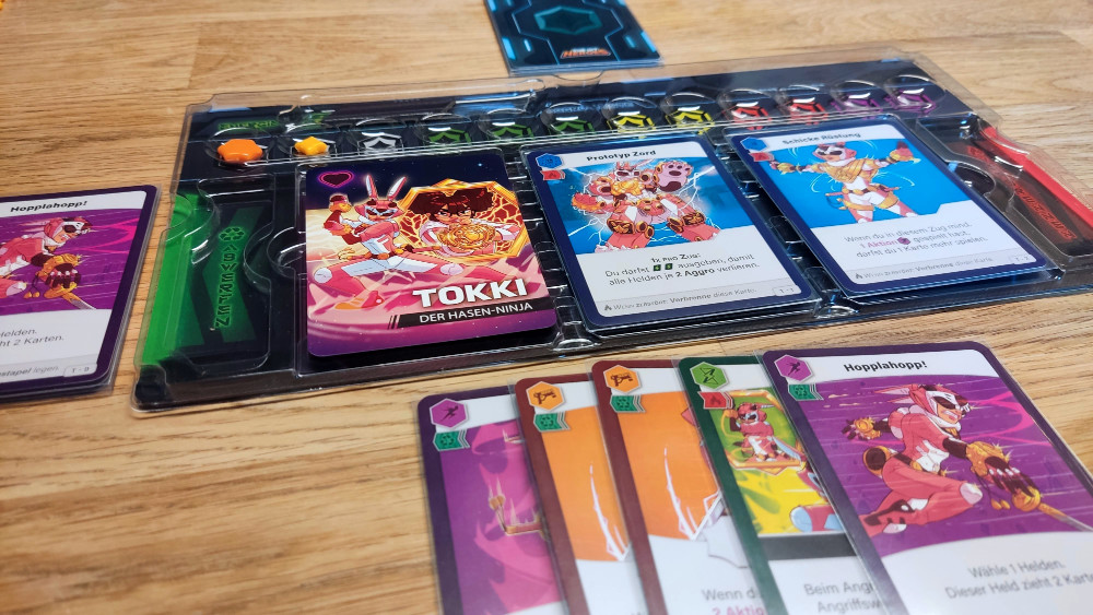 Daher braucht es Absprache. Ja, es kann zum Alpha-Spieler-Problem kommen, aber bei uns in der Familie war es so, dass durch die Asymmetrie jeder andere Ideen für die spielerische Lösung eines Problems parat hatte. Während ich mit Tokki, dem Ninja-Bunny, grübelnd über meinen maximalen Schadensoutput nachdenke, kann mir Lukas mit Edric, einem Tanky-Schotten, helfen, weil er Aggro transferiert. Mailo mit Sofia, der Sniperin, hätte für seinen späteren Zug hingegen gern mehr Handkarten. „Hey, Mailo, dann supporte ich dich mit Hopplahopp, zieh mal zwei Karten. Und danke Lukas, du nimmst gleich meine Aggro und ich mache dafür doch noch mehr Schaden als gedacht.“ Wir zirkulieren, wir kommunizieren, wir tauchen intensiv ab.
