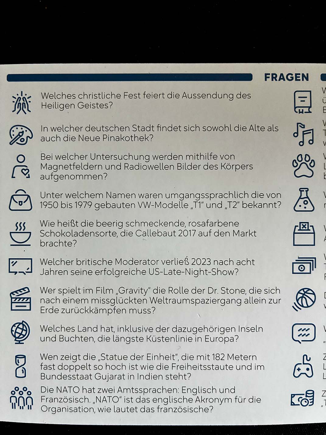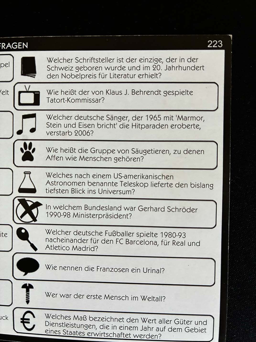 Die erste Version war noch von Mattel und kommt mit Plastik-Spielsteinen daher. Ein fettes Plus der ersten Ausgabe sind 5000 Fragen. Allerdings gibt es die wohl eher auf dem Sekundärmarkt. In der zweiten Version wurde Plastik gegen Holz getauscht, das Spielfeld in die Schachtel integriert und die Kategorien etwas differenziert und verändert. So ist in der zweiten Edition die Kategorie Architektur weggefallen. Finde ich gut, denn die war bockschwer. Dafür ist die allgemeine Kategorie Medien der ersten Edition in Fernsehen & Radio und Serien aufgesplittet worden, denn Film als Kategorie ist in beiden Editionen fester Bestandteil. Was ich schade finde: Durch die veränderten Kategorien und die neu gestalteten Piktogramme der zweiten Edition kann man die beiden Spiele nicht mischen. In anderen Ländern gibt es von dem coolen Spiel noch einige Ableger mit neuen Themen wie z. B. Fantasy, Timeline oder Family. Die haben aber bisher, bis auf Familie, noch keine deutsche Lokalisierung bei Asmodee.