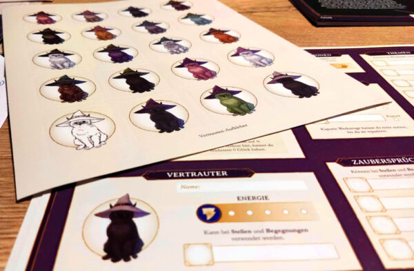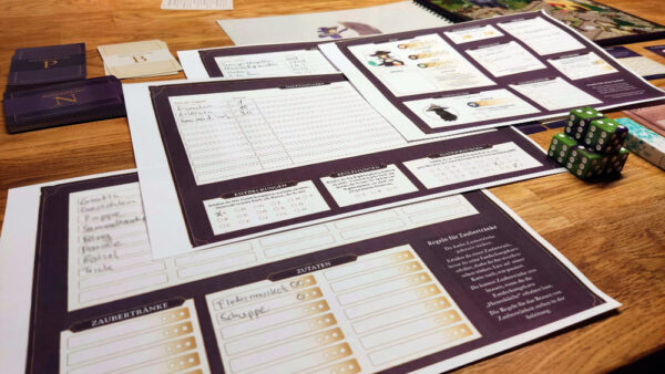 Witchbound verlangt somit Müßiggang und weniger die Hatz nach vorn. Die Texte und Zeichnungen genießen. Sich an den Mini-Spielen erfreuen. Wirklich, ich feiere das ab. Wo bitte sind so klassische Mini-Spiele wie Angeln oder Glücksspiel aus der Welt der Videospiele schon in die analoge Form gebannt? Dazu gesellt sich eben besagter Charme von Pen & Paper: Zaubertränke, Zaubersprüche, Fertigkeiten, Kennwörter, Errungenschaften … Reni besteht nicht umsonst aus vier Charakterblättern. Endlich konnten wir Witchbound genießen und es entsteht der gesunde Sog, das nächste kleine Geheimnis noch lüften zu wollen.