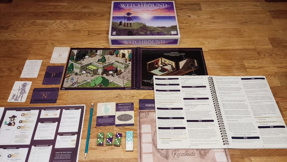 Als ich Witchbound erblickte, dachte ich an eine zuckersüße Mischung aus einem Point & Click wie Monkey Island und einem Pen & Paper-Light wie Little Wizards. Solche Verbindungen finde ich nicht nur per se spannend, sondern mich interessieren einfach Brettspiele, die klassische Mechaniken aus Videospielen zu adaptieren versuchen. Wenn dabei noch eine coole Geschichte erzählt wird, dann bleibt der Streamingdienst sicher ausgeschaltet. Stattdessen vergrabe ich mich mit meiner Frau in die analoge Unterhaltung. Wie also schlägt sich Witchbound im Vergleich zu Cantaloop, Tainted Grail oder Heredity: Die Geschichte von Swan?