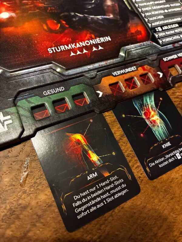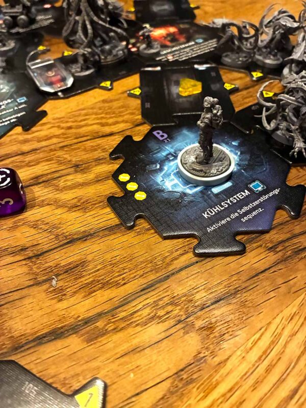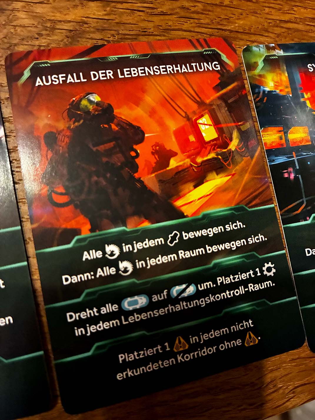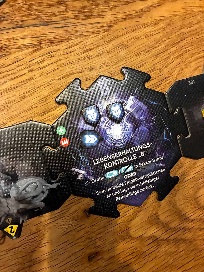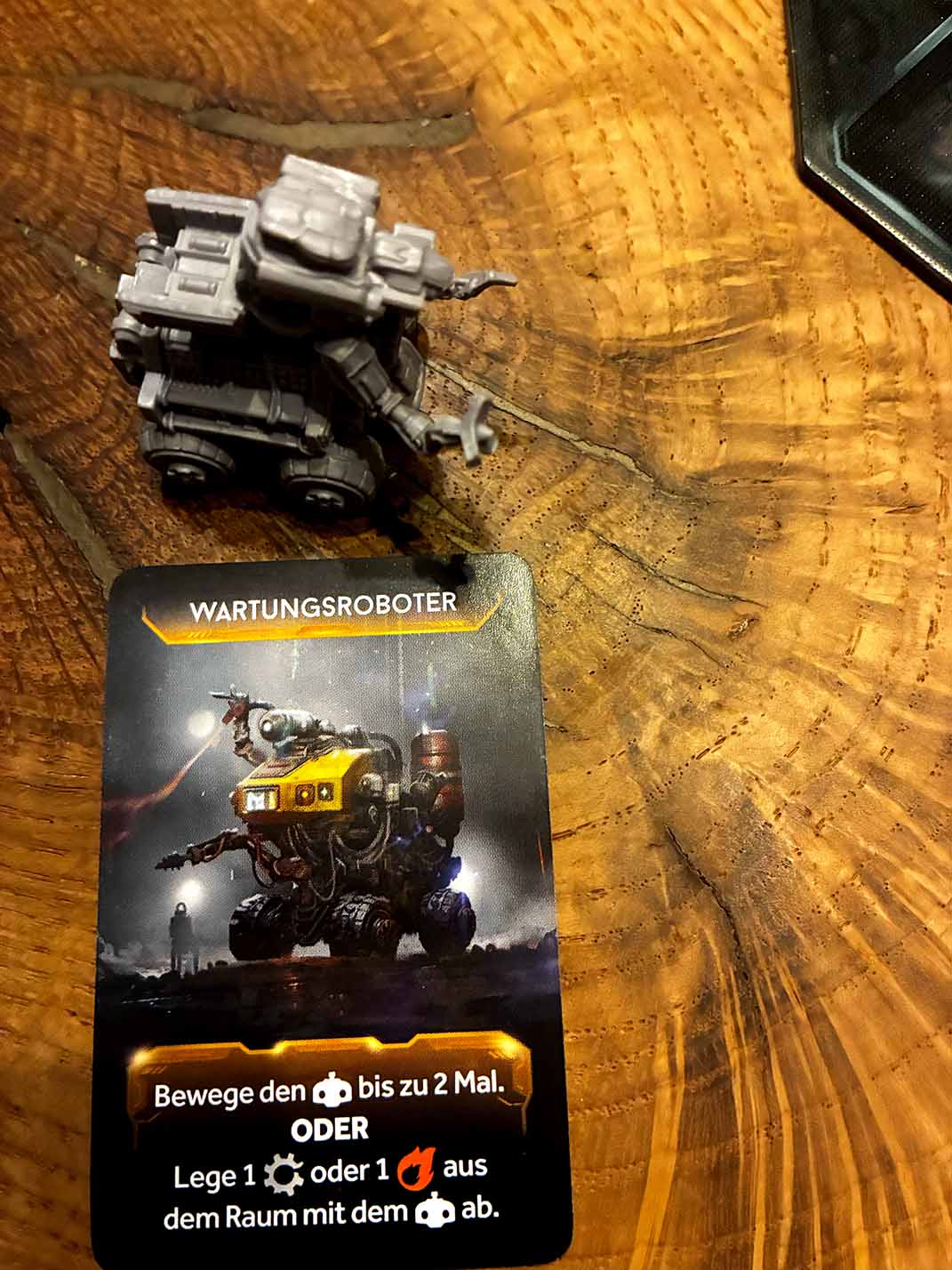 Dazu später mehr. Wir erreichen die Kryokammer und haben Zugriff auf den Roboter. Mega. Es gibt unterschiedliche Roboterkarten, die erst beim Erreichen des Roboters enthüllt werden. Und dieser Roboter kann einen fetten Einfluss auf die Spielstrategie haben. Das ist fast schon ein cineastischer Kniff, der mich so tief eintauchen lässt. Warum? Nun, kommen wir nun endlich zum Uwe-Dilemma und seinem Weg mit Marco im Süden der Station.