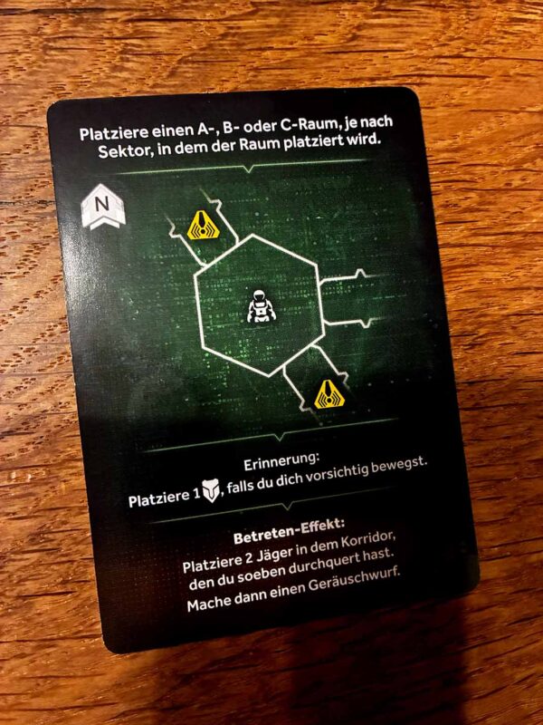 Im Norden ist die Kryokammer und ein Roboter soll sich dort befinden. Das ist die einzige Information, die wir aktuell haben. Also machen wir uns nach Norden auf. Ich tippe auf den Korridor dorthin und ziehe eine Erkundungskarte. Bei den Erkundungskarten steigt der Puls und die Spannung ist greifbar. Ein irre spannedes und thematisches Element, weil ich nie weiß was am Ende des Korridors zu finden ist. Diese Karte gibt an, ob ich einen A, B oder C Raum passend zu meinem Sektor ziehe oder einen der vielfältigen Räume vom Fragezeichenstapel. Die Station entfaltet sich und das jedesmal aufs neue. Auf der Erkundungskarte sind zudem neue Korridore verzeichnet, die angelegt werden und die weitere Richtung vorgeben. Was passiert noch im Raum? In welchem Korridor liegt bereits Geräuschmarker? Alex und ich bewegen uns stetig zur Kryokammer. Und was machen Uwe und Marco?