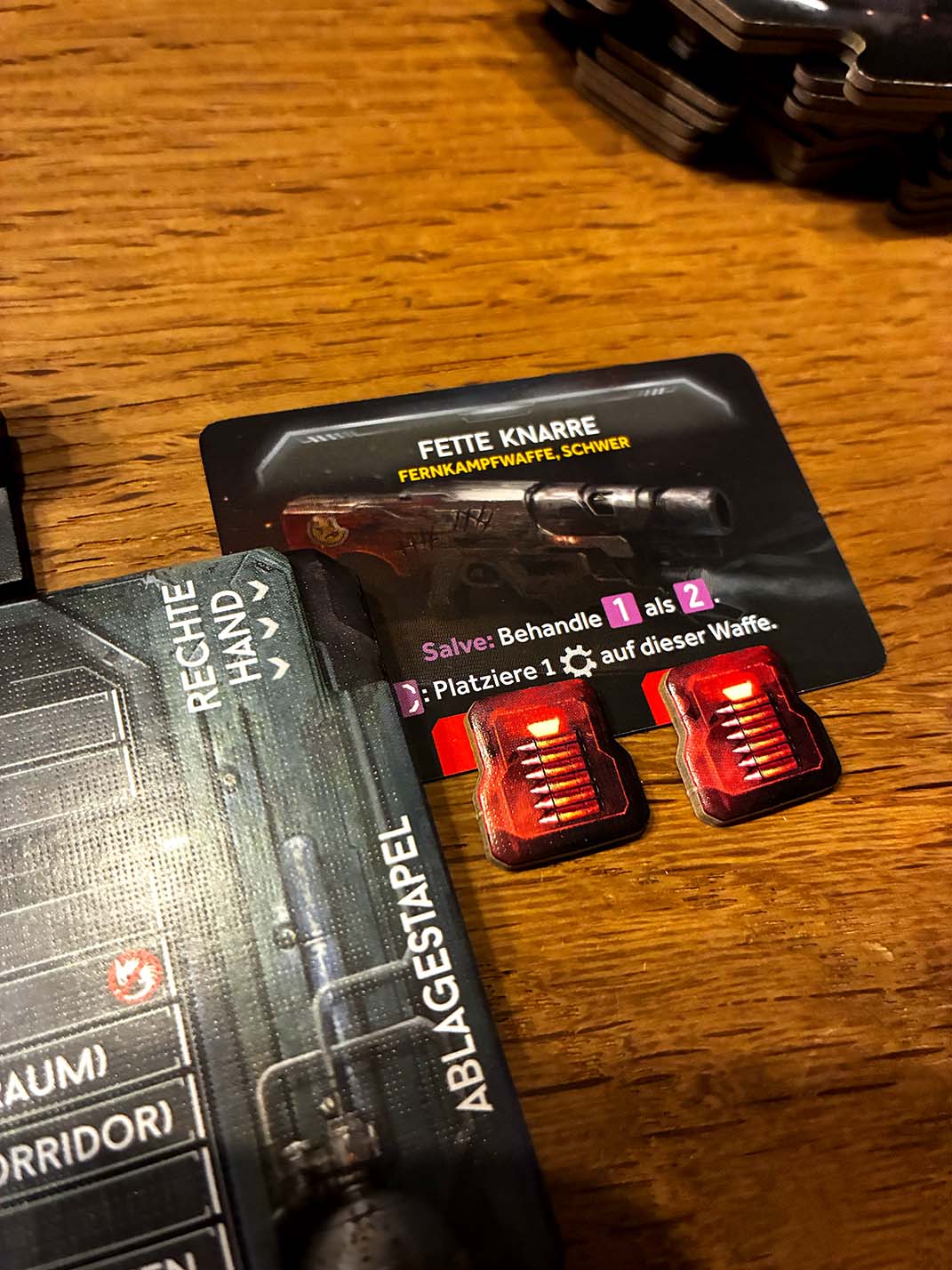 Bullshit. Ich ziehe gerade aus dem Alienbeutel, weil meine Geräuschprobe im Korridor einen Angriff ausgelöst hat. Ich ziehe. Eine Horde Jäger erscheint – vier an der Zahl. Aber ich lächele müde. Meine Sturmkanoniererin ist bis zu den Zähnen bewaffnet und wirft als Erstes eine Granate in den Korridor. Bäm. Der Würfel zeigt eine 3, dazu kommen +2 von der Granate. Alle Aliens kleben zerfetzt in Stückchen an den Korridorwänden. Einfach nur mega. Die meisten Aliens erscheinen jetzt in den engen Korridoren, ergo greift hier eine einfachere Kampfmechanik als in den Räumen, wo die Biester einfach flinker sind. Diese kleine Modifikation ist super elegant gelöst und macht das Spiel fluffiger, epischer und kampffreudiger. Das neue Munitionssystem sorgt zudem dafür, dass ich gerne und gut schieße. Habe ich bei Nemesis jede Kampfaktion ob der kargen Munition sorgfältig geprüft, halte ich hier fröhlich meine Wumme in das Aliengetümmel. Denn ich verbrauche nur Munition, wenn das entsprechende Symbol auf dem Würfel erscheint. Also widme ich mich voller Übermut der Königin.