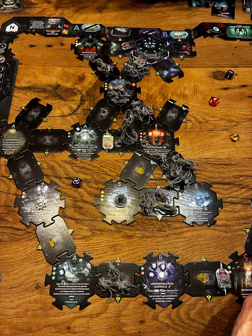 Das regeltechnische Problem an dieser Situation: Kein Korridor darf zu einem bereits entdeckten Raum führen. Wir können und dürfen also unseren Teil der Station nicht mit dem erkundeten Raum von Uwe und Marco verbinden. Die Lösung in dieser Partie: unser Roboter und seine Fähigkeiten. Wall-E kann nämlich einen neuen Korridor bauen und diese Regel aushebeln – nämlich dort, wo er steht. Alex und ich kämpfen uns martialisch durch die Alienmasse und sichern dabei den Roboter, sodass er den rettenden Korridor bauen kann. In der Theorie. Nachdem die Königin mich aus dem Weg geräumt hat, fallen die Horden über Alex her. Game over. Nur Marco schafft es mit letzter Kraft zur Landungszone und hat Glück, dass die Flugabwehr der Station inaktiv ist und das rettende Shuttle landen kann.