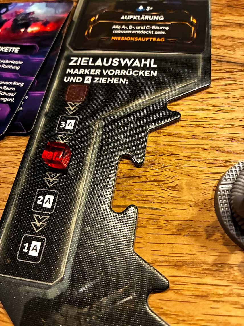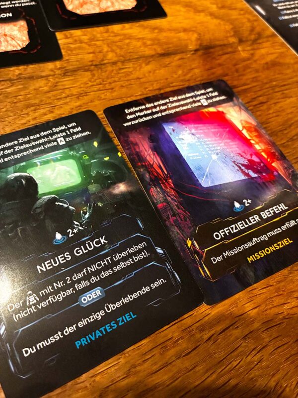 Ein häufiger Kritikpunkt an Nemesis war -nicht nur in unserer Gruppe – die Festlegung auf ein Ziel. Nach Erscheinen des ersten Xeno musste ich wählen, welches Ziel ich erfülle. Das private oder das des Konzerns? Meistens war das in der ersten Runde der Fall und maximal zufällig. Und nun? Eine geniale Änderung löst dieses Problem: Ich bestimme den Zeitpunkt einfach selber. Allerdings erhalte ich einen Bonus von drei Handkarten, wenn ich das als erster Spieler im Spiel tue. Passe ich später, werden es weniger Karten. Das passt zu meinem Plan. Ich kann mich gut für ein Ziel entscheiden, werfe also das andere ab und ziehe als Erster drei Karten nach. Mit acht Karten würde ich dann die Königin hart angehen.