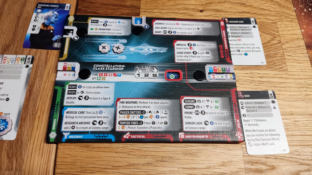 Da Star Trek: Into the Unknown sich anders und frisch spielt, noch ein paar wenige Zeilen zur Grundmechanik. Jedes Raumschiff besteht wie in der filmischen Vorlage aus verschiedenen Bereichen der Brücke mit ihren Konsolen. Dargestellt durch ein fettes, aufwendig produziertes Tableau pro Schiff. So befindet sich dort der Captain’s Chair, aber auch z. B. Bereiche für Navigation, Sensoren,Waffensysteme oder Kommunikation. All diese Konsolen können nur Aktionen über einen zugeteilten Offizier als Karte ausführen. Hast du keine Offizierskarte an den Waffensystemen, kann dein Schiff also nicht schießen. Punkt.