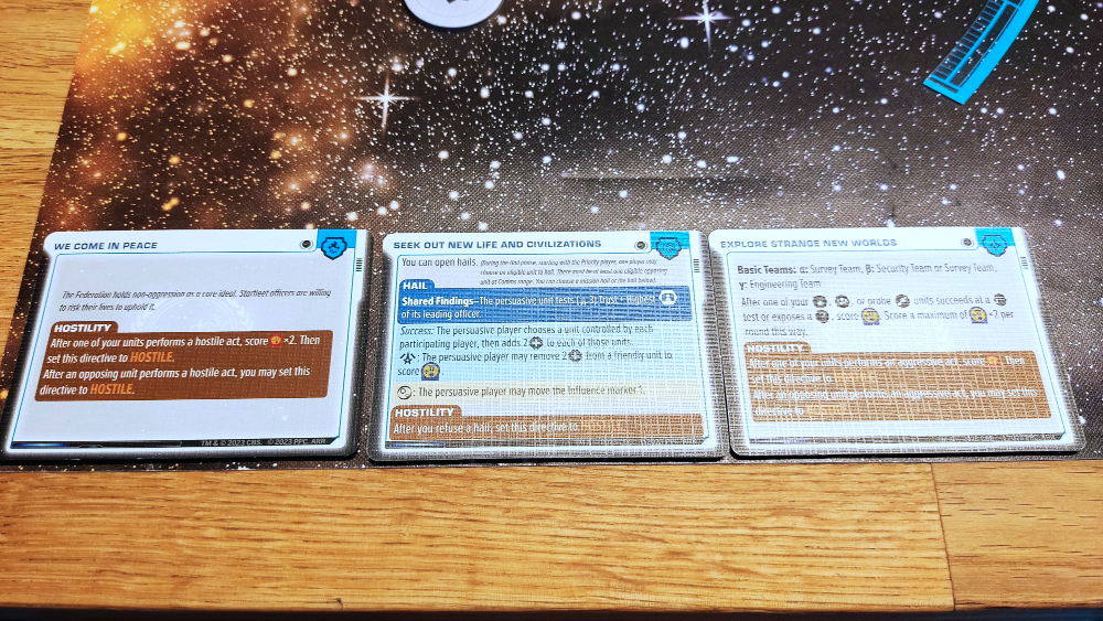 Währenddessen erhellt Phaserfeuer dein Wohnzimmer und dein oller Holzstuhl wird zum Captain’s Chair, auf dem du Befehle brüllst und dich in die Sitzlehnen krallst. Roter Alarm! Lateraler Impuls Stufe 5! Schilde, maximale Energie! Shuttles? Natürlich auch dabei. Du hast Sensor- und Kommreichweiten. Du funkst feindliche Raumschiffe an und betreibst Mini-Mind-Game-Verhandlungsspiele auf der Brücke gegen die Person gegenüber. Es gibt sogar spielerische Vorgaben durch „Direktive“ der jeweiligen Fraktionshintergründe. Ja, Star Trek: Into the Unknown ist so viel mehr als nur Kampf. Ich habe sicher sogar noch Spielelemente vergessen. Kurzum: Das, was du aus Serien kennst, ist hier drin. Von der Raumschlacht bis zur Diplomatie an der kitzligen Schwelle vor dem roten Alarm. Leute, Gänsehaut, bis in die Fußspitzen.